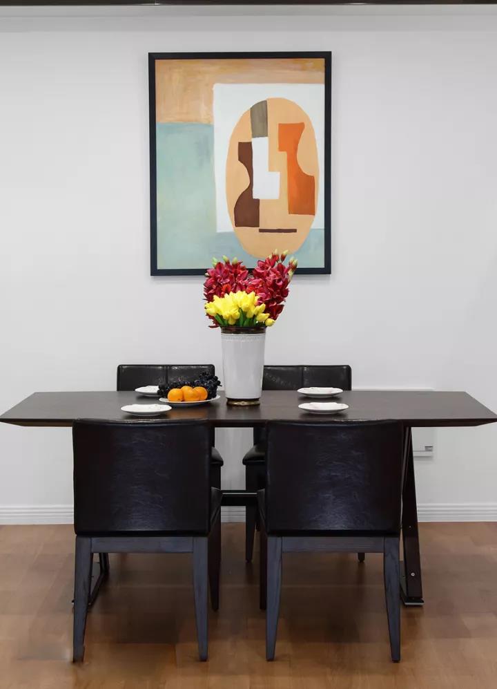 餐厅的设计更有现代感,深木色的餐桌和黑色的皮艺椅子结合,搭配墙上的艺术装饰画和桌上的花卉,显得简洁而又。