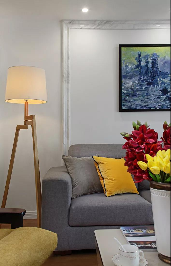 在沙发背景墙上还用大理石做了个装饰线条,和电视背景墙相互呼应。浅灰色的布艺沙发和白墙、装饰画的设计,简单而又轻松。