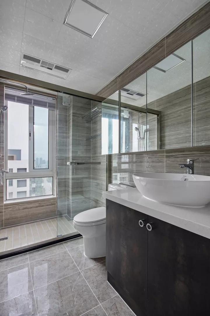 主卫的墙地面铺上抛光砖,独特的纹理让卫生间显得更加时尚。玻璃淋浴房和大面积镜柜的运用,让主卫的空间视觉感得以延伸。