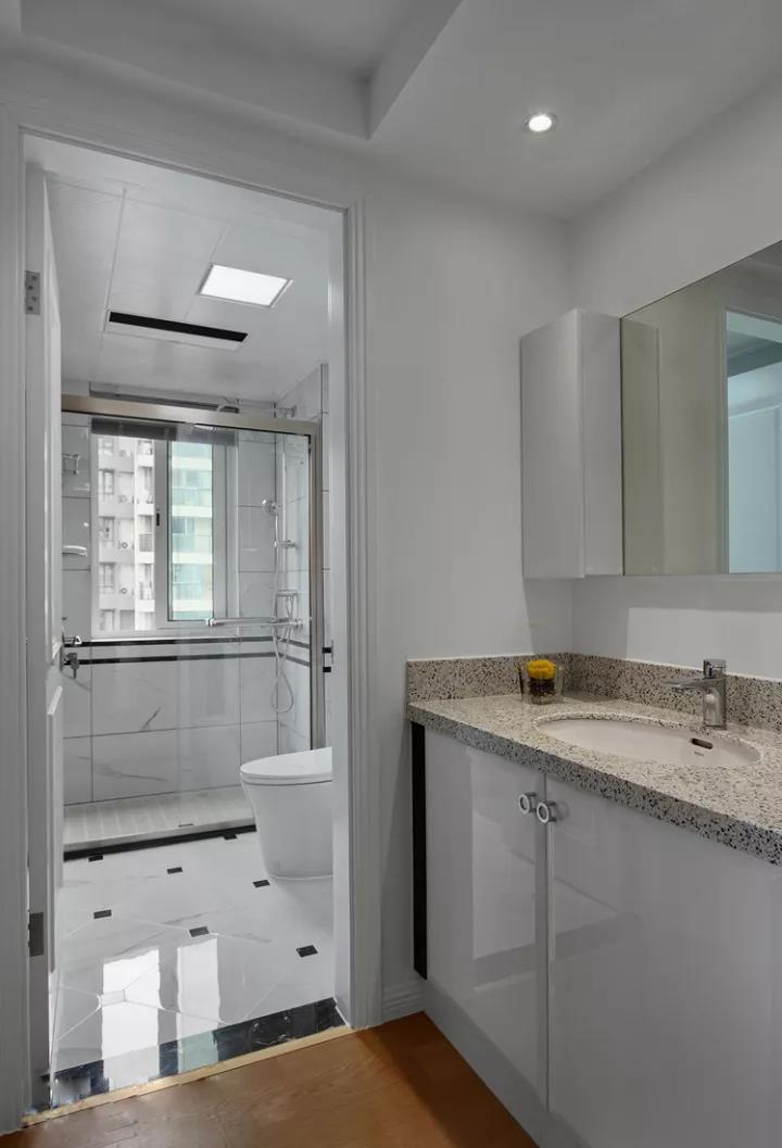 客卫的洗手台被放在了门外,内部也做了干湿分离的设计,三个空间的地面都不相同,形成一个层次分明的空间视觉感。