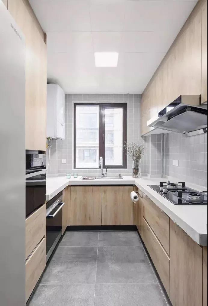 厨房在鞋柜对面,U型橱柜布局,操作灵活,储物充足,更大化利用空间,原木橱柜搭配白色台面,让厨房环境显得简洁又自然,地面贴灰色地砖,与墙面颜色形成呼应,大气耐脏。