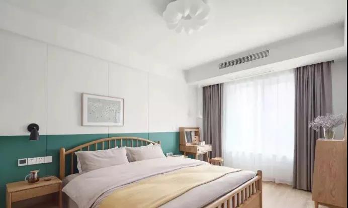 卧室的所有家具都是原木材质,床头背景墙做了硬包造型,简洁大方,用白色和墨绿色拼接,增加空间层次感,床头两边分别是床头柜和梳妆台,满足不同的使用需求,床尾的斗柜,增加了卧室的收纳。