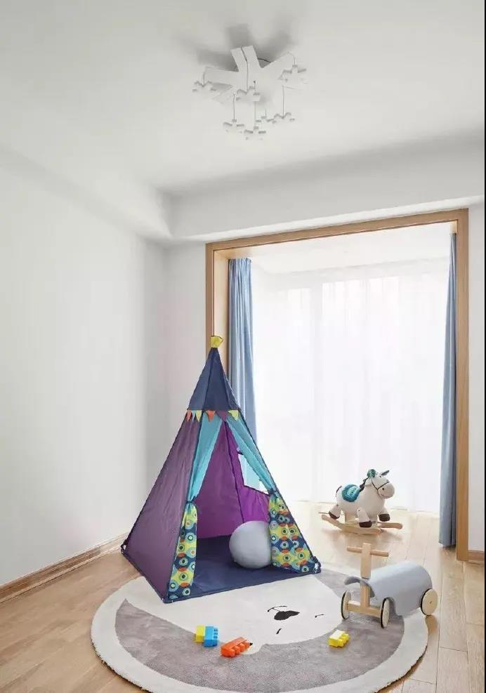 次卧作为儿童房使用,地上铺了小熊地毯和各种玩具,还搭了一个小帐篷,供孩子玩耍,很有童真童趣,这里只拍了一部分,里面还添置了床、衣柜还有书桌,功能很齐全。
