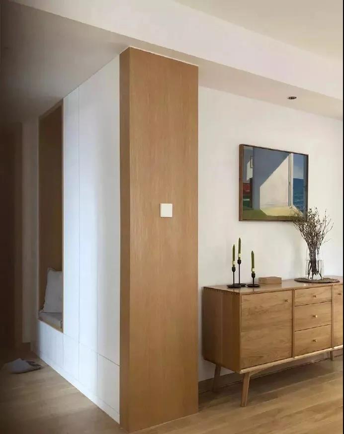 进门左手边打了到顶鞋柜,非常节省空间,无拉手隐形门,柜子里面预留出换鞋凳的位置,方便回家坐着换鞋。