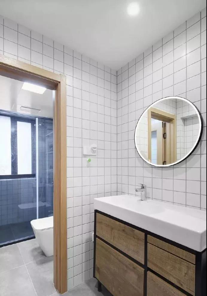 卫生间将洗手台设在外面,洗漱如厕互不干扰,大大的提高了生活效率,墙面贴白色格子砖,干净清爽,十分耐看,里面用玻璃门实现了干湿分离,比较节省空间。