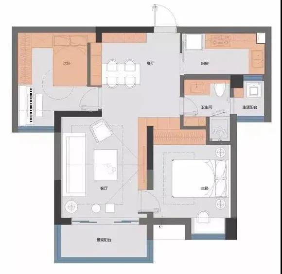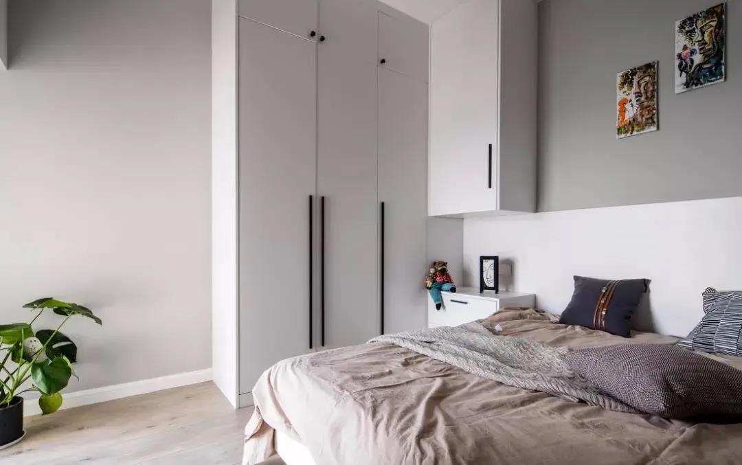 次卧的空间比较小一些,床头柜和衣柜结合在一起,靠窗的位置空着,方便以后给孩子摆放一张书桌,让他/她有个安静的学习环境。