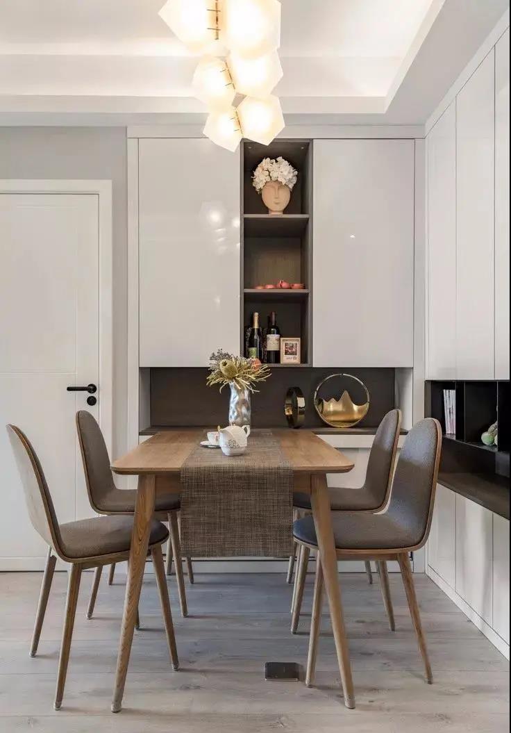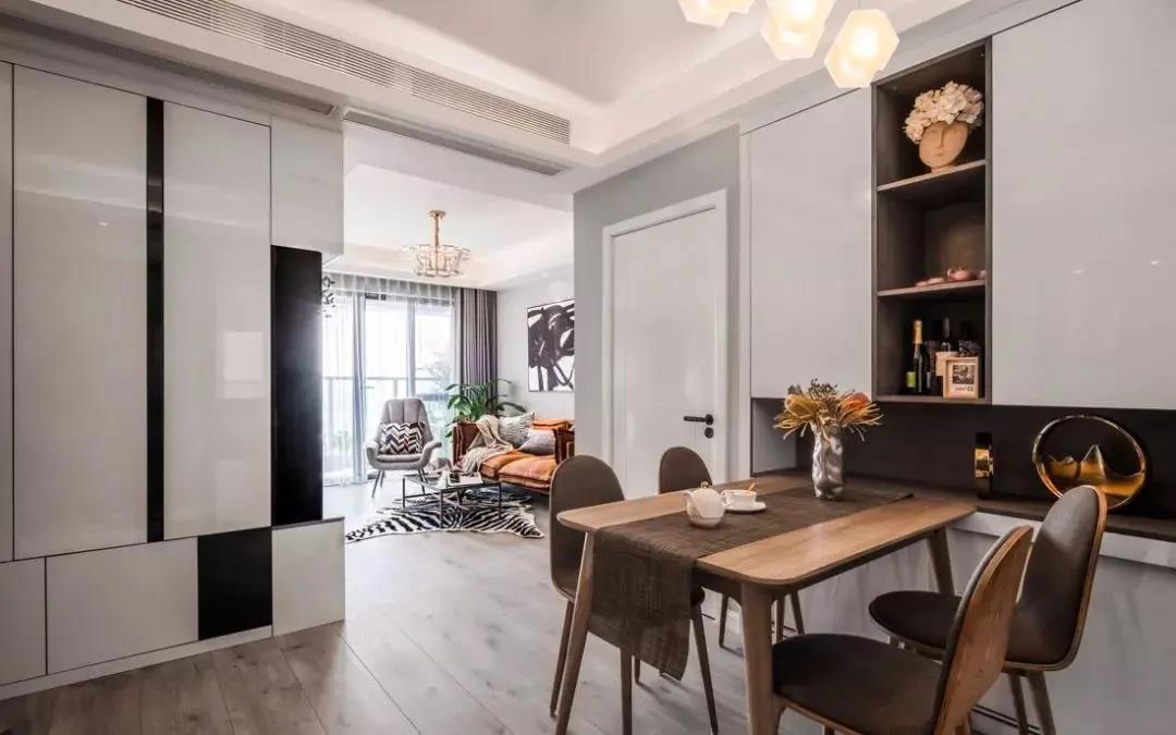 入户没有玄关走廊的户型,进门的个空间就是餐厅,正对入户门处做了黑白色的柜子,和电视背景墙连通起来,非常实用。