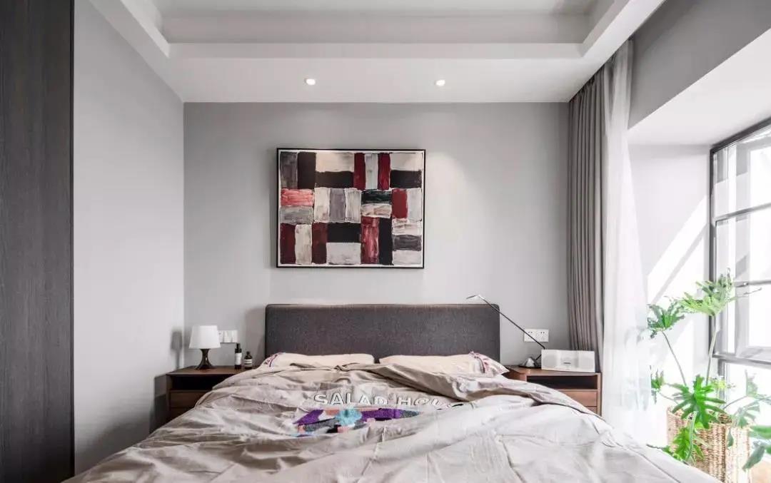主卧室同样也是以灰色为主,嵌入式的柜子也让整体感显得更强,飘窗位置被砸开用来摆放一些绿植,增添卧室内的自然气息。