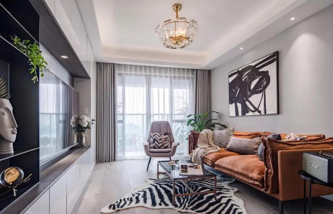 客厅整体以灰色调为主,搭配橙色的沙发、创意的挂画和一个虎皮纹地毯,软装与硬装的结合,给人一种感在空间展开的感觉。
