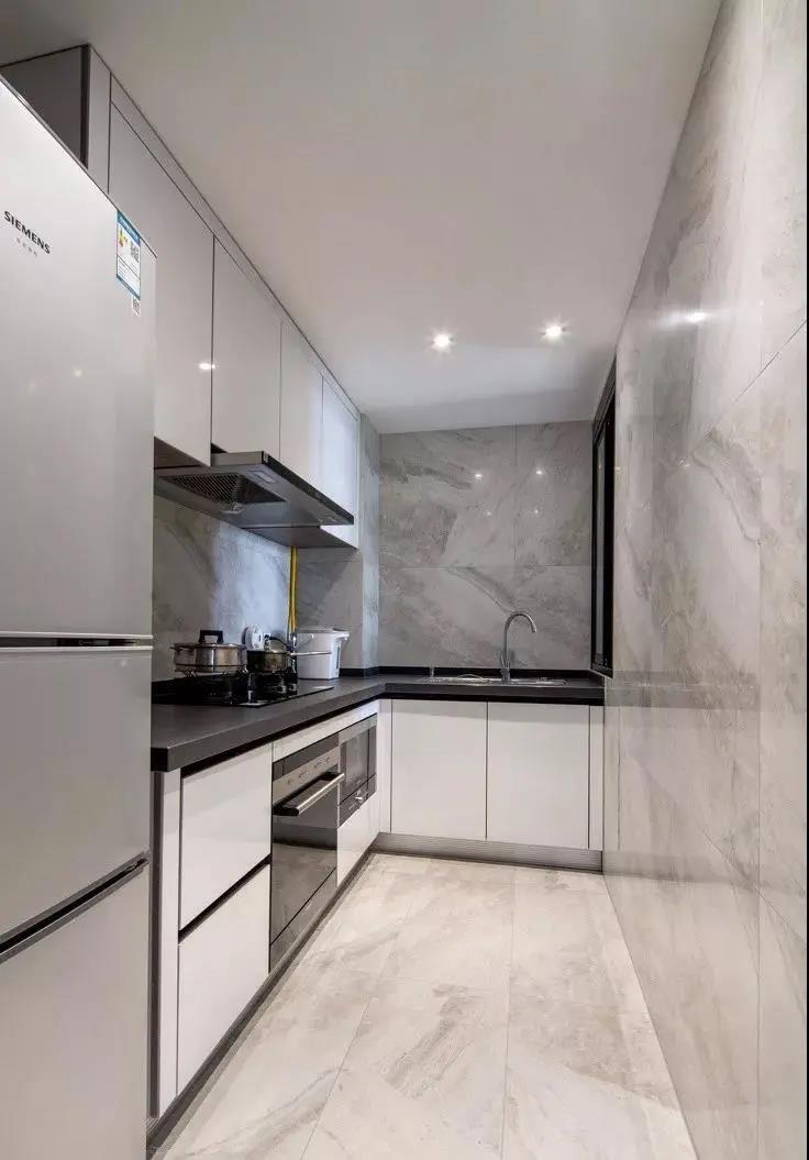 厨房空间,L型的橱柜布局,冰箱被摆放在柜子的边上。厨房的墙地面通铺大理石瓷砖,搭配白加黑的橱柜、台面,非常大气。