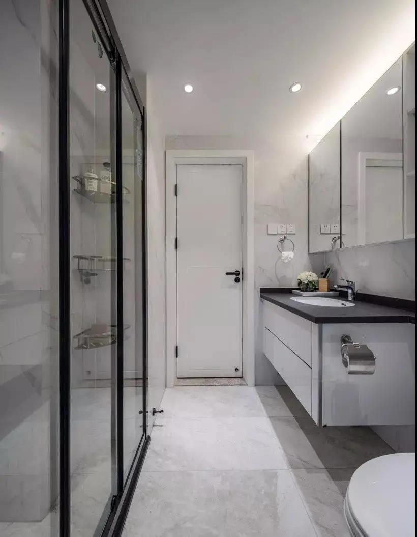 卫生间内干湿分离,淋浴房的内部做了转角置物架,和洗手台、马桶上方的大镜柜结合起来,让卫生间看起来更宽敞,也不用担心东西放不下了。