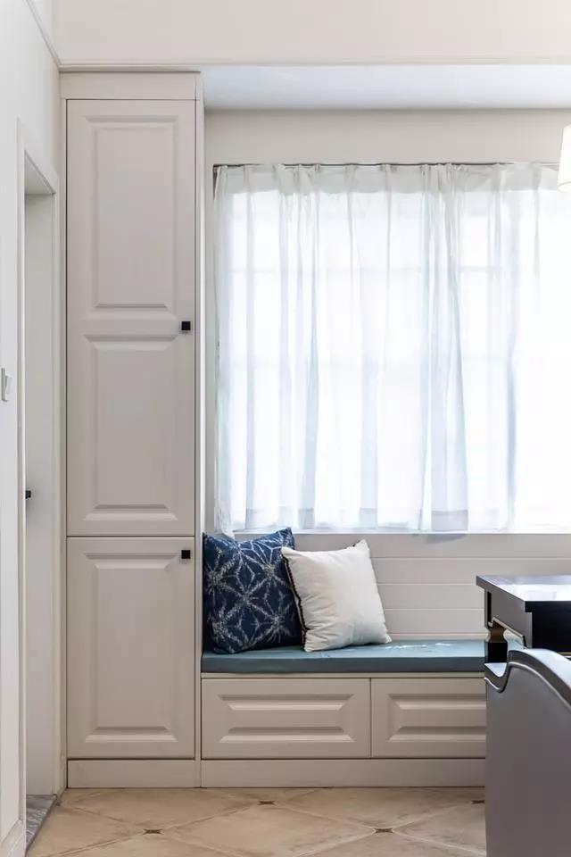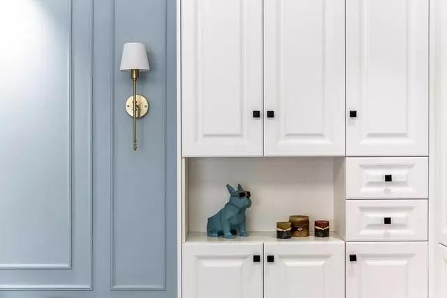这里我们可以看到这个户型的玄关是比较窄的,所以这里就借着了客厅的墙面,定制了一面转角型的大型收纳柜,白色柜体加黑色把手,经典时尚又耐看。