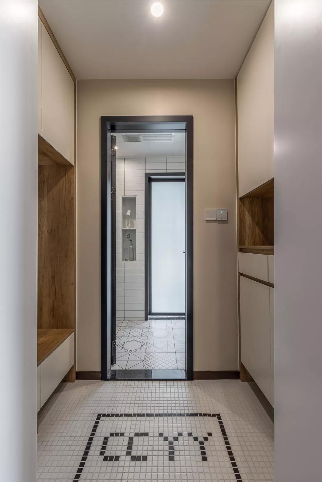 玄关的鞋柜是利用了通往卫生间的这个走廊来做,鞋柜和换鞋凳结合的设计,使用起来更加方便。地面白色小砖内嵌入一些黑色小砖做图案,显得简洁又文艺。