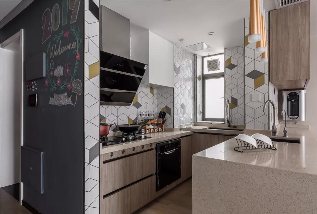 黑板墙的边上就是厨房空间,橱柜做了L形的布局,厨房和餐厅之间用吧台作为隔断,墙面创意的几何瓷砖让厨房看起来更加宽敞。