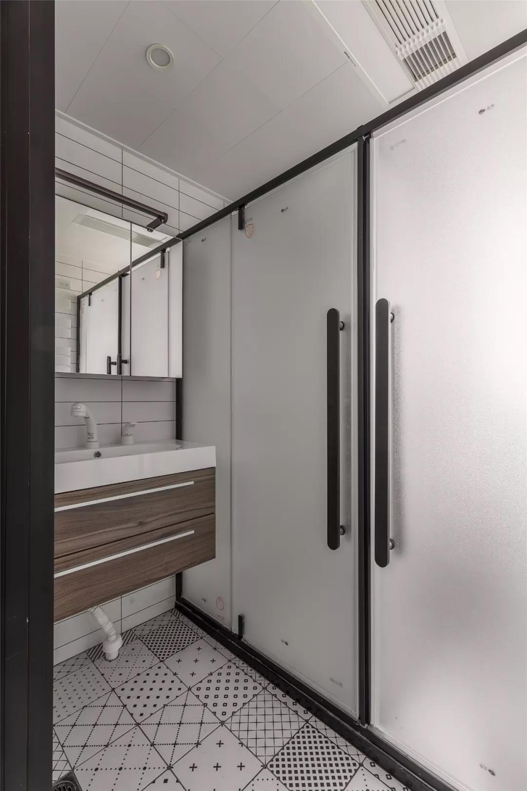 卫生间做了干湿分离的设计,地面铺贴了黑白色的花砖,用磨砂的玻璃门作为淋浴房的隔断,让卫生间多出一些私密感。
