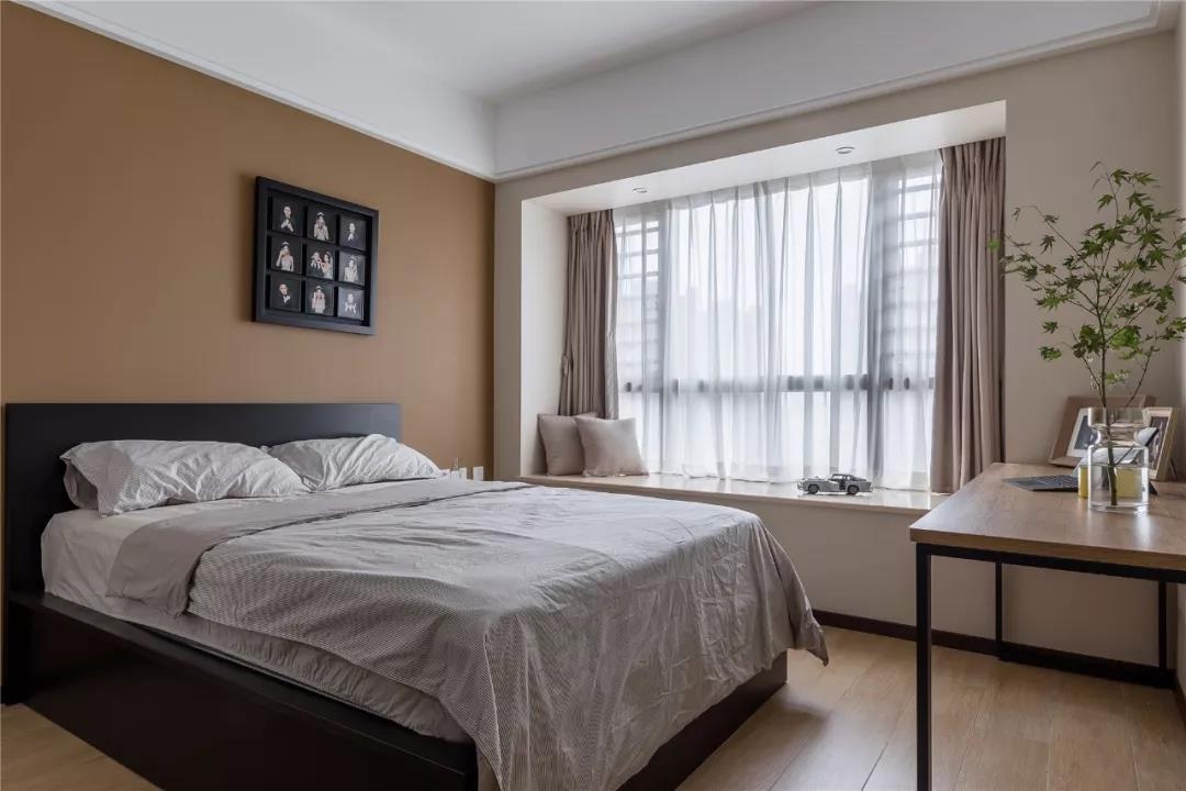 主卧室的床头背景墙刷成了深咖色,搭配黑色的装饰画和黑色的床,显得更有档次感,整个卧室的软装布置也显得非常端正有气质。