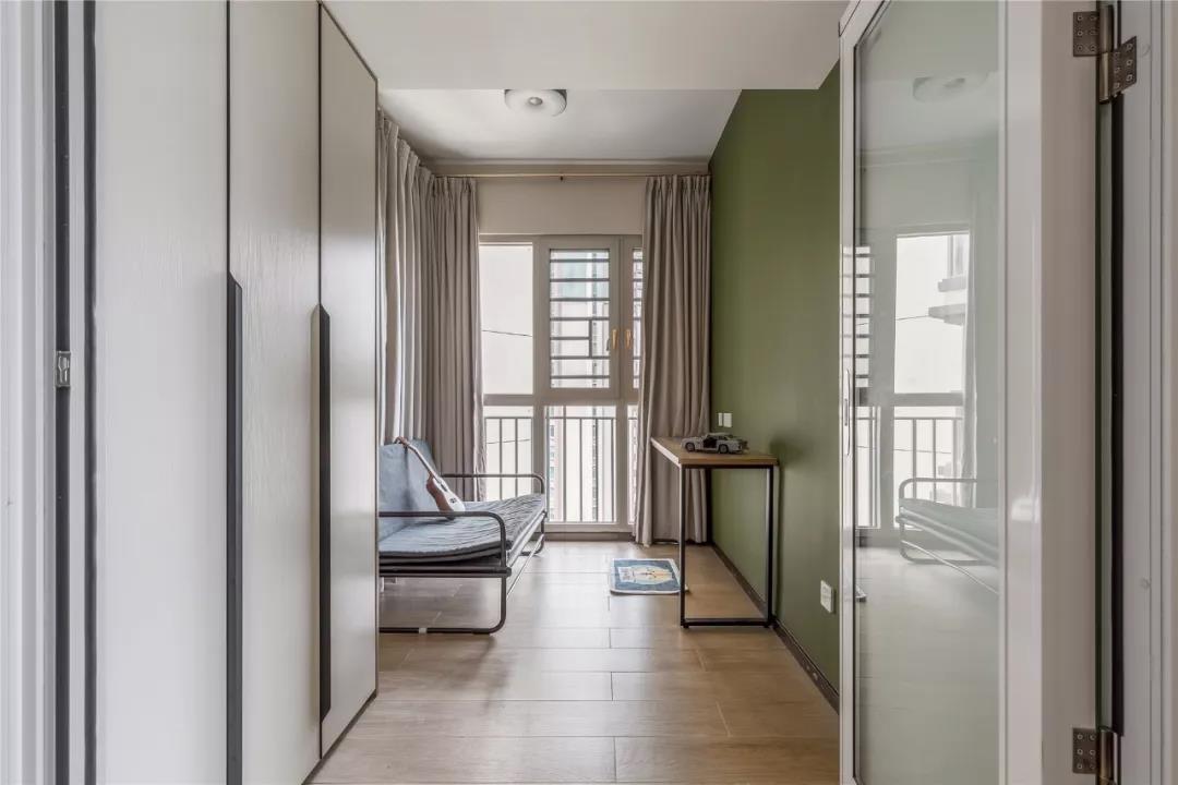 次卧暂时没有摆放床,一张悠闲的沙发搭配一个小书桌,侧方做上衣柜,后续只需要添置一张床就可以作为卧室使用了,在这里看看书非常惬意。
