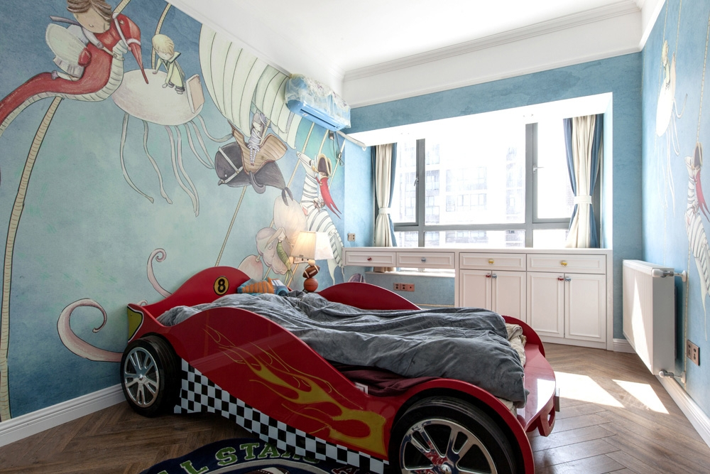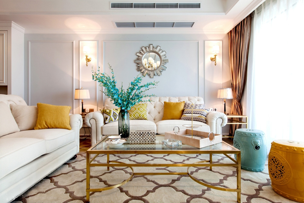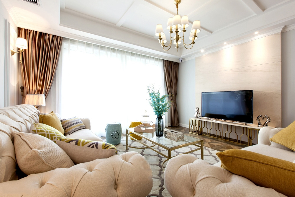 计说明:该户型南北通透,每个房间都比较舒适,女主人是一位性格活泼且擅于发现生活美的萌妹子,男主人是一位自由职业者。两人育有几个月大的宝宝。对有质感的金属物品特别喜欢,比较喜欢法式的质感,现代美式的色彩。最终整个风格装饰定位为法式及现代美式结合的混搭。客餐厅空间较大,没有做过多的硬装设计,在整个配饰上,我们选择金色框架家具、金色灯具进行搭配,整个空间既有现代美式的清新色彩,又有法式的质感和格调