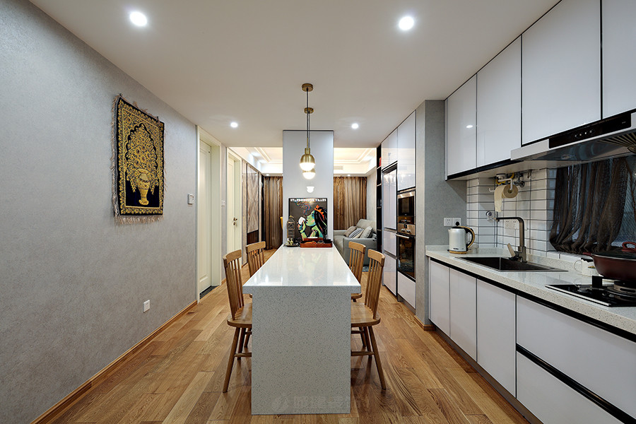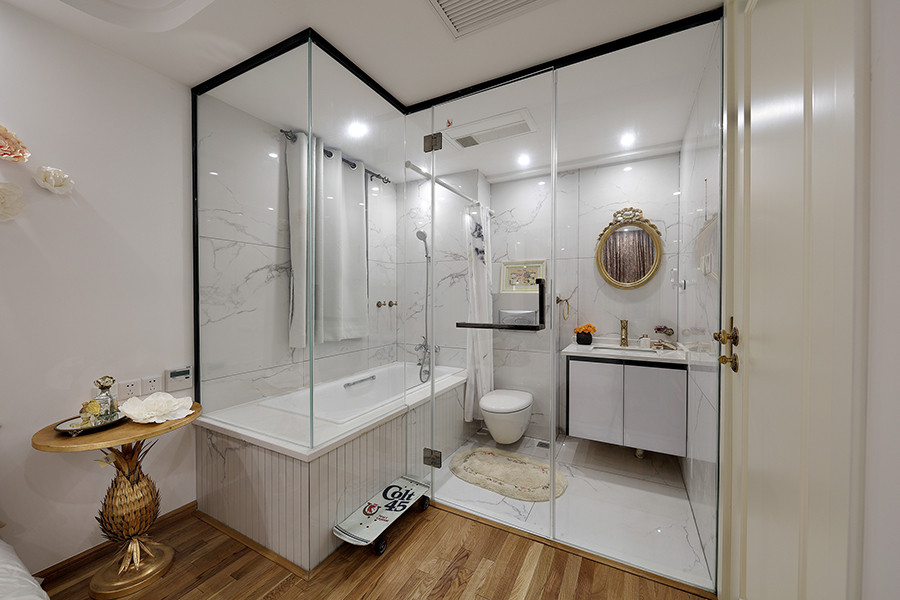 设计理念:业主一家三口,女主人热爱生活,所以对设计希望美观与实用兼得。本案中设计师采用了开放式厨房,餐厅一体的设计,拉伸空间又保证功能。 女儿在国外留学,也是位小有个性的女生,所以女儿的卧室在设计上女性风格浓郁,透明的卫生间是一大亮点