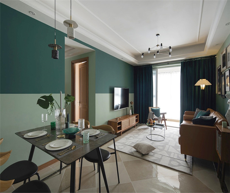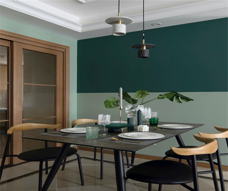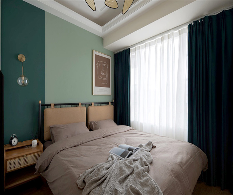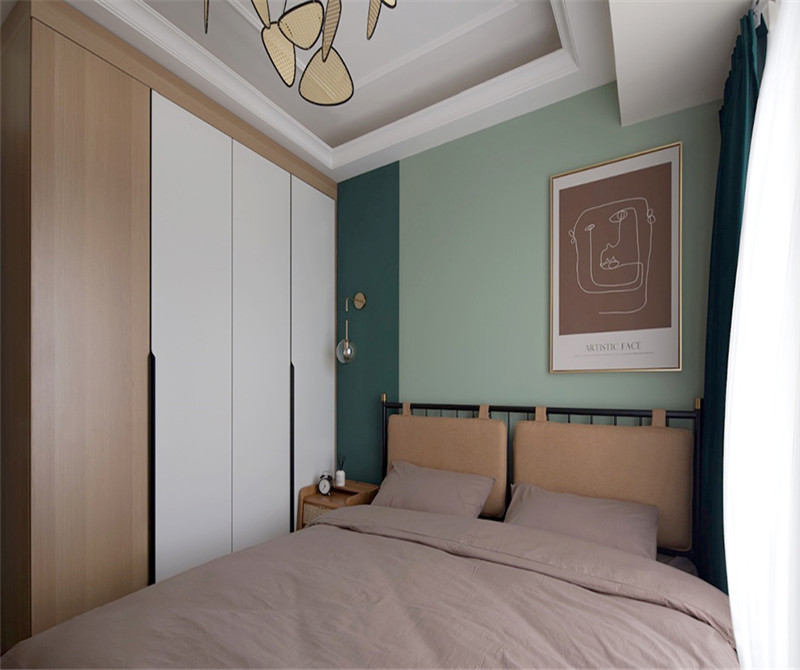 本案在硬装方面没有过多的装饰,只做了墙面乳胶漆的分区。主要通过软装来实现功能的优化,全新氛围的营造。深浅两种绿色,没有做琐碎的造型。给夏日带来一点沉静和微凉。儿童房用了比较清新的淡绿色做背景墙。由于面积不大,用了全屋定制,榻榻米、衣柜、书桌。实现空间利用的化。减少卫生死角。