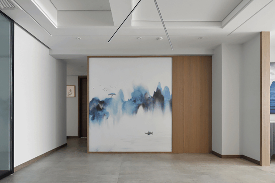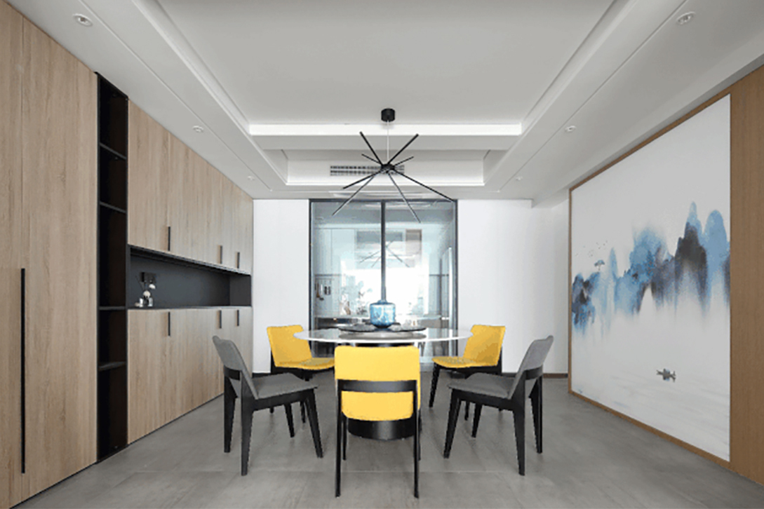 这一套180平米的大平层户型中,整体空间宽敞自然,以简洁大方的现代风格为空间的硬装基础,在墙上加入墨意格调的装饰背景,洁白墙面搭配木饰面质感,让现代感的空间,营造出舒适轻松的大方感。大门开在客厅与餐厅区域之间,布置一个优雅的端景台,让回家充满