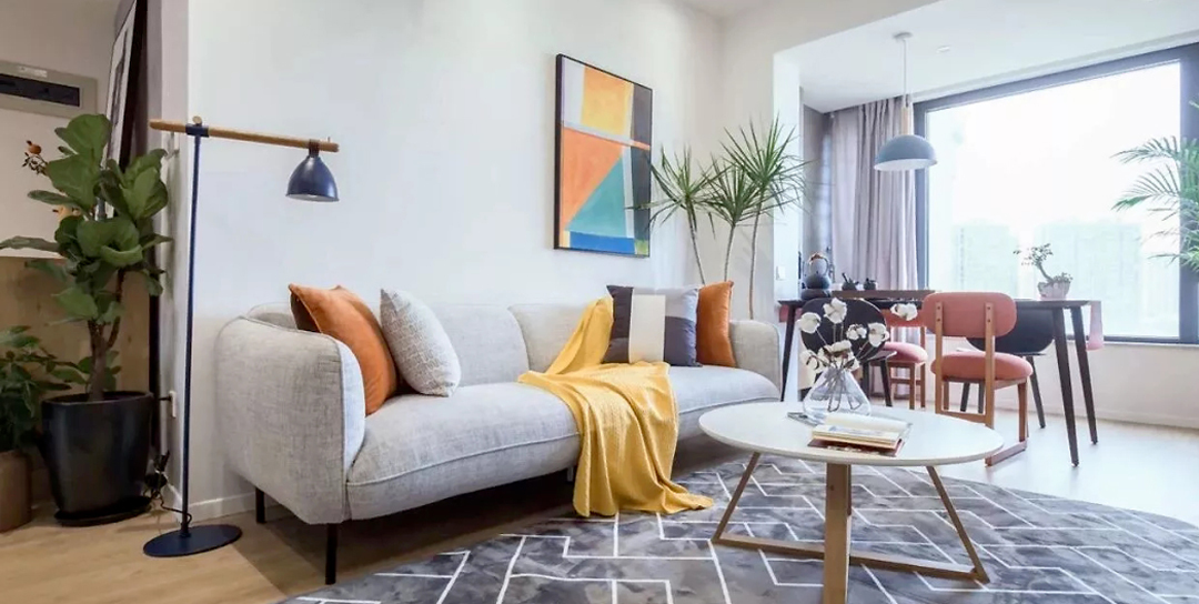 客厅,沙发背景墙以缤纷的挂画装点,浅灰色的布艺沙发配以焦糖色及灰黑白几何抱枕,与挂画色调巧妙呼应,点缀得恰到好处