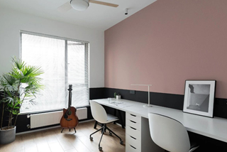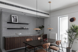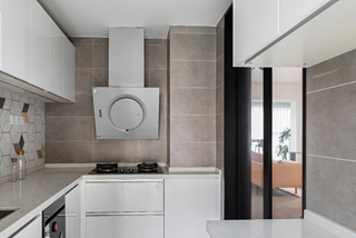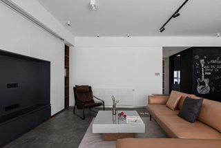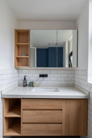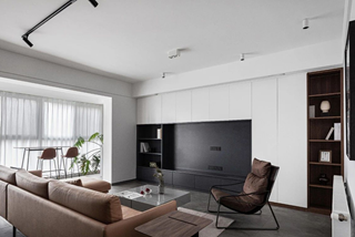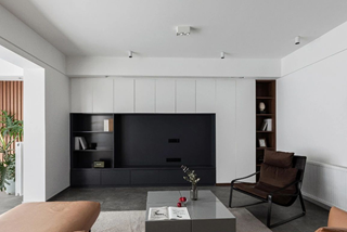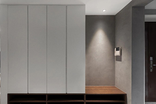 通往客厅的过道定制的玄关柜,避免了过道的浪费,增强了鞋柜的收纳机能。预留了换鞋位,开放柜可以放常穿的鞋子,拿取也很方便