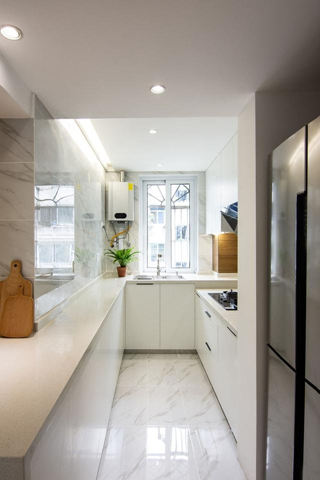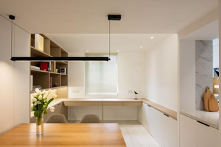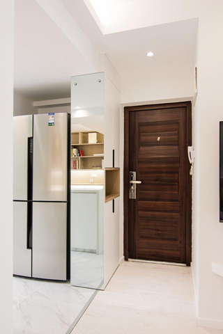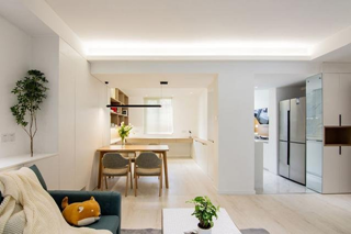 餐厅右侧做矮柜隔断,将空间打通提高居家互动和实用性。日常做好的饭菜,又可以直接通过这里传递到餐厅,不需要像改造前绕一个大弯。拆除原有吊柜和石膏线,局部吊顶拉高层高,筒灯和灯带设计提供照明,让玄关更加明亮。