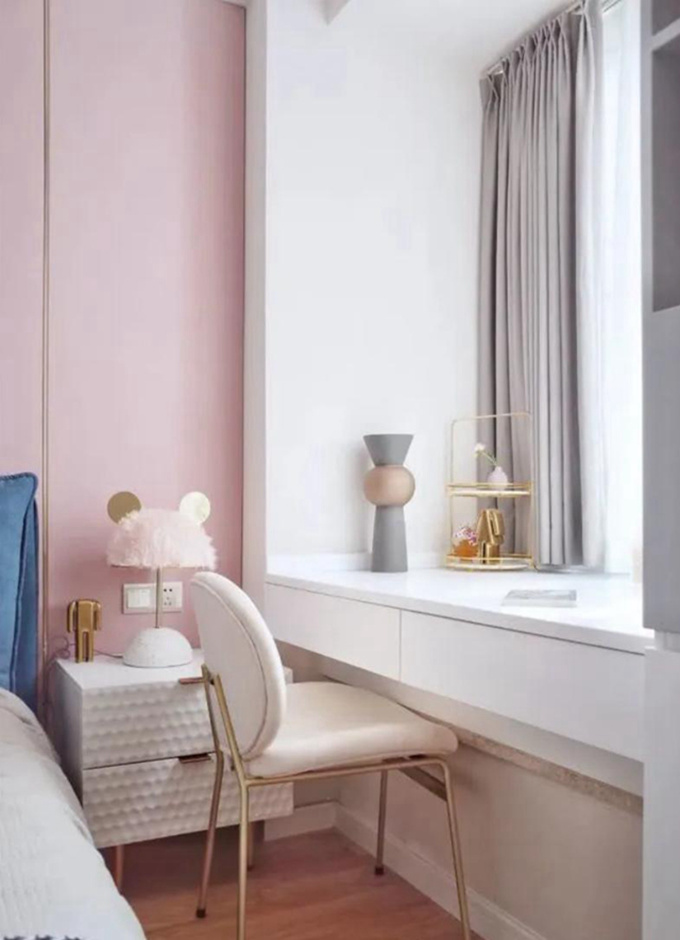 4、飘窗连接到床头,取消原来的床头柜设计,做成相连的书桌或者化妆桌,扩大收纳面积,不浪费每一寸空间。