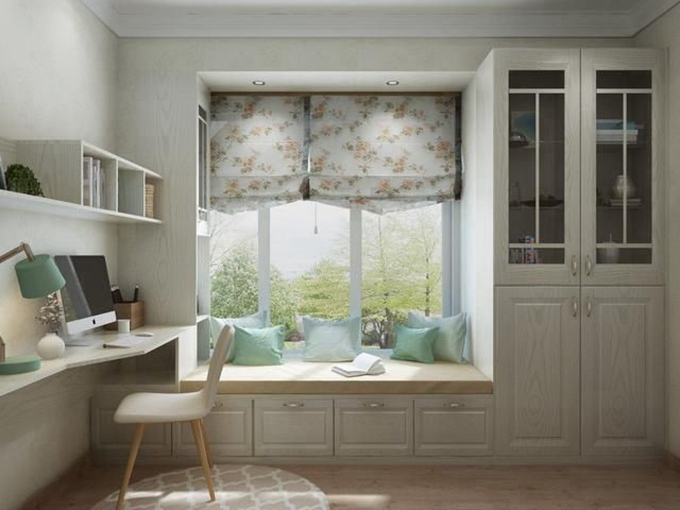 2、墙面不能砸掉的可以选择在飘窗上方加入抽屉格,搭建柜子和隔板都是不错的选择,这样可以合理利用空间,放一些随手取用的东西。